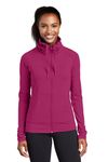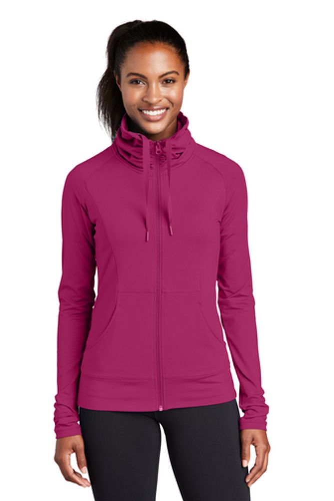 A stretchy, moisture-wicking performance jacket with a soft-brushed backing and unique cowl collar.